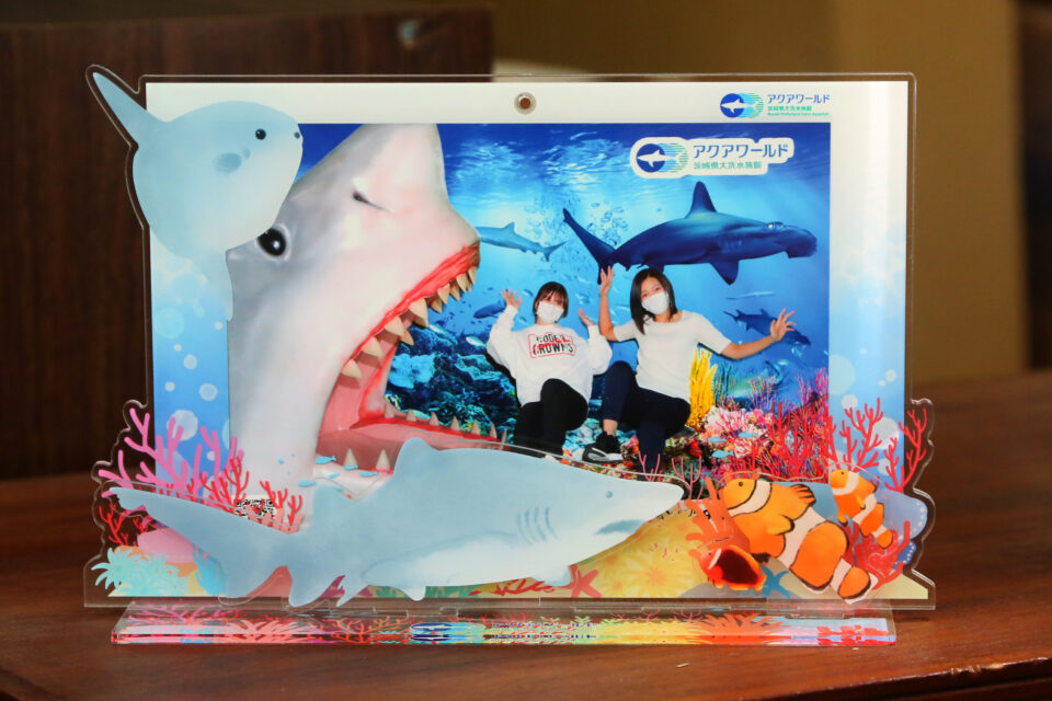 大きな口を開けたホオジロザメの巨大オブジェと一緒に記念撮影ができます。背景はグリーンバック合成。お客様には緑色の椅子に座って撮影していただくので、両足を上げたポーズで撮ると、まるで水中に浮かんでいるかのような仕上がりに。お子様も大興奮!サメで有名な大洗水族館でしか味わえない、大人気の撮影スポットです。大洗水族館へお越しの際はぜひご利用ください。
