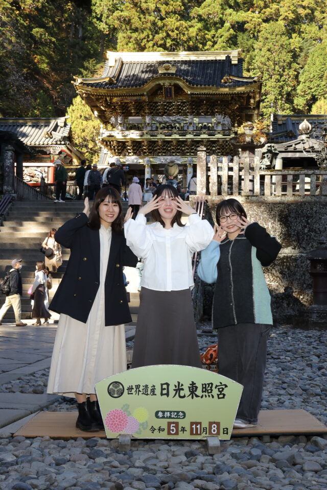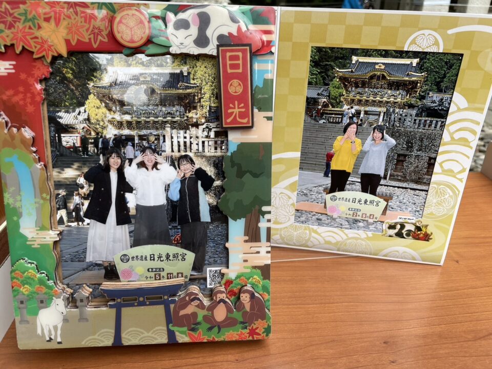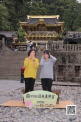 日光東照宮では国宝、陽明門を背景に記念写真をお撮りしています。撮影を楽しんでいただくために三猿のポーズがお勧めしております。日光東照宮へ訪れたさいは、私たちフォトコーナーを是非、ご利用ください。