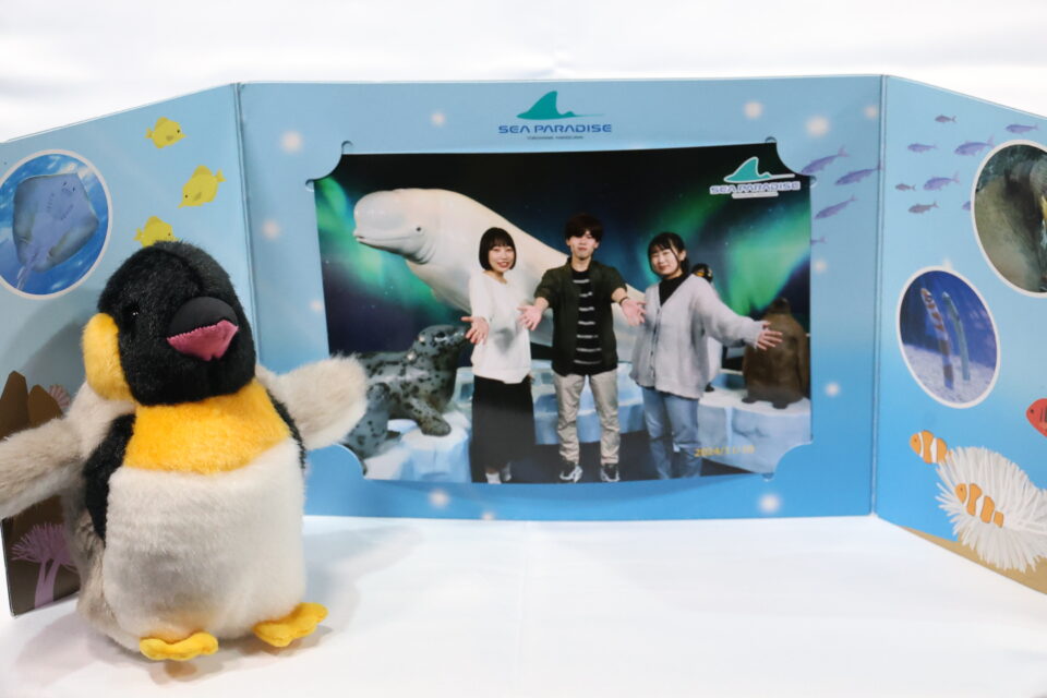 八景島シーパラダイスの中でも一番大きい施設、アクアミュージアムの入り口で営業しています。実物大のシロイルカの存在感は抜群!他にもハイイロアザラシの親子やオウサマペンギンの親子もお出迎えしています。遊びに来た思い出は勿論、誕生日などの記念日にも気軽に撮影に参加してください!