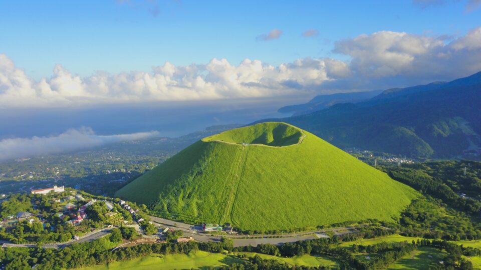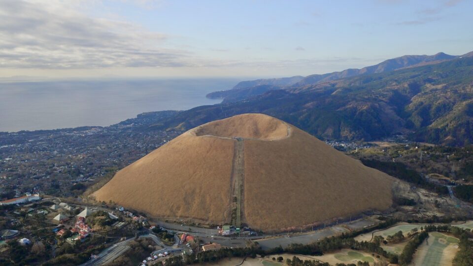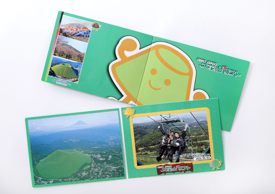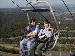 大室山ではリフトに乗って標高580mの山頂まで空中散歩。山頂からは南アルプス、伊豆諸島、房総半島、そして運が良ければ富士山まで見渡せる360度の大パノラマ! 山頂付近ではカメラ君が記念撮影をしています。自分達では撮影出来ない雄大な景色をバックに素敵な想い出創りのお手伝い。カメラ君のマイクパフォーマンスにも是非ご注目!