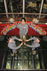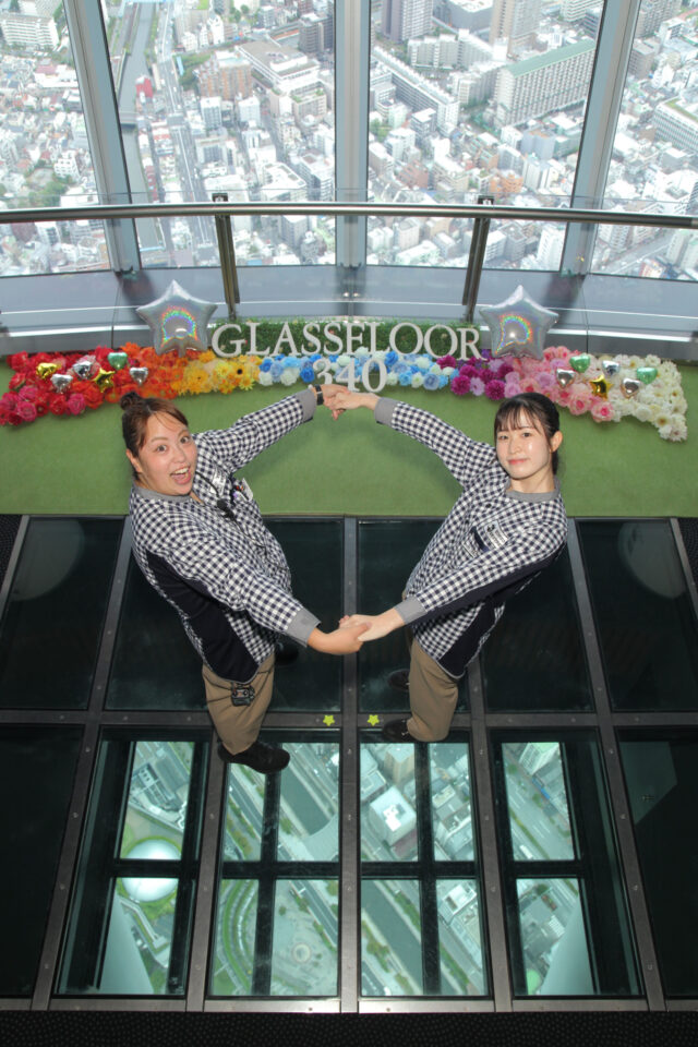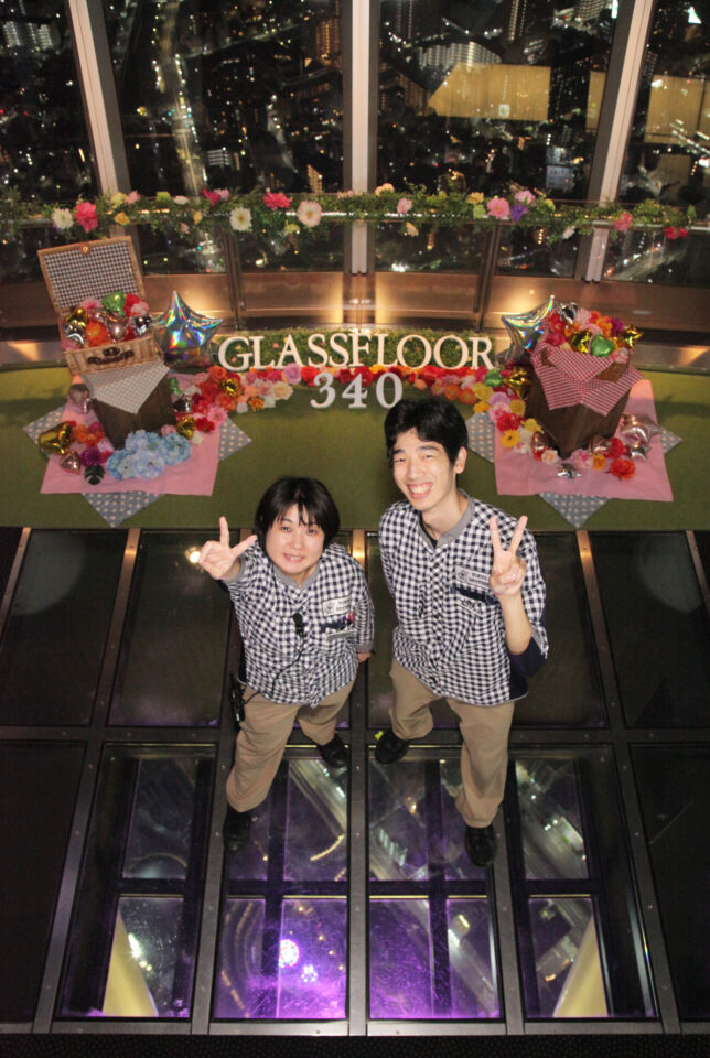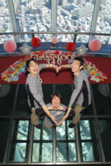 ガラス床フォトサービスはガラスの上に立って、お客様と直下の景色を写真に収めることができるフォトスポット!